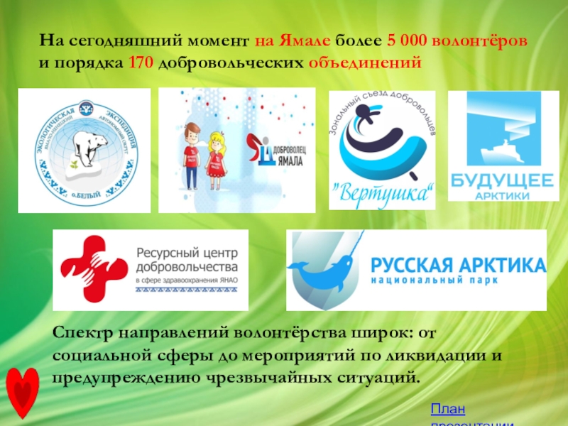 Спектр направлений волонтёрства широк: от социальной сферы до мероприятий по ликвидации и предупреждению чрезвычайных ситуаций.