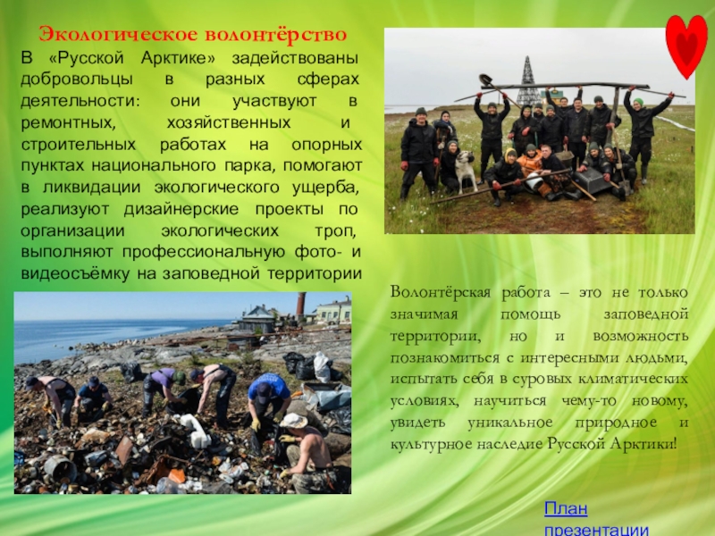 В «Русской Арктике» задействованы добровольцы в разных сферах деятельности: они участвуют в ремонтных, хозяйственных и строительных работах на опорных пунктах национального парка, помогают в ликвидации экологического ущерба, реализуют дизайнерские проекты по организации экологических троп, выполняют профессиональную фото- и видеосъёмку на заповедной территории и многое другое.