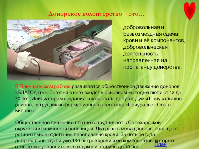 Общественное движение плотно сотрудничает с Салехардской окружной клинической больницей. Два раза в месяц доноры посещают региональное отделение переливания крови. За четыре года добровольцы сдали уже 130 литров крови и ее компонентов, которые отныне могут храниться в окружной столице до 10 лет.