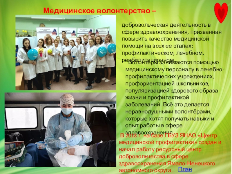 В 2018 г. на базе ГБУЗ ЯНАО «Центр медицинской профилактики» создан и начал работу ресурсный центр добровольчества в сфере здравоохранения Ямало-Ненецкого автономного округа.