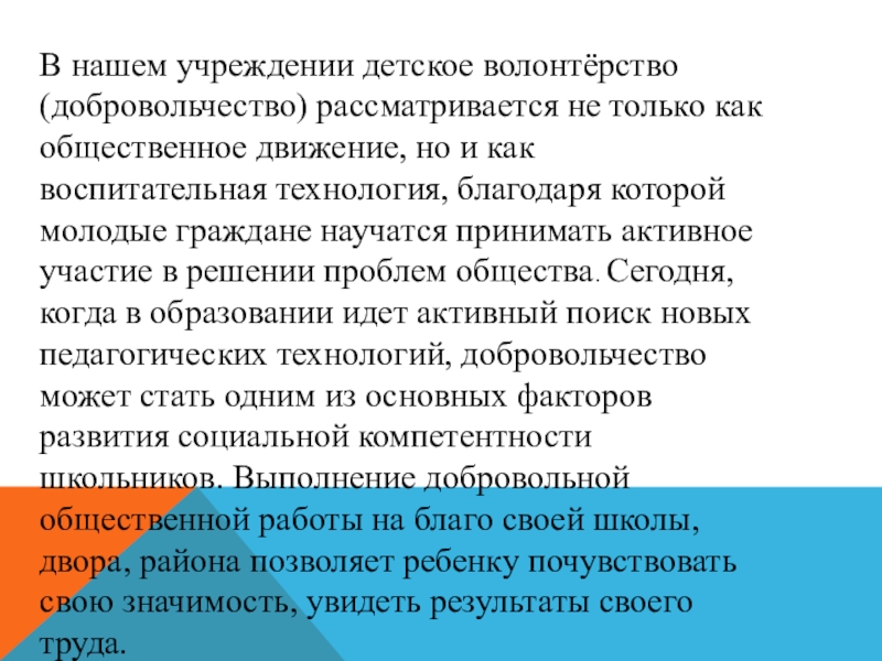 движение, но и как воспитательная технология, благодаря которой молодые граждане научатся принимать активное участие в решении проблем общества. Сегодня, когда в образовании идет активный поиск новых педагогических технологий, добровольчество может стать одним из основных факторов развития социальной компетентности школьников. Выполнение добровольной общественной работы на благо своей школы, двора, района позволяет ребенку почувствовать свою значимость, увидеть результаты своего труда.
