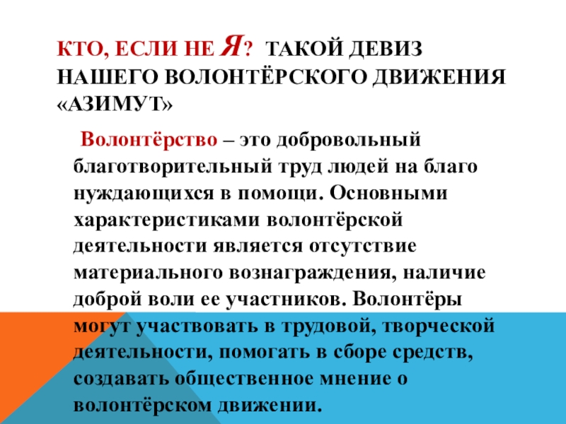 Слайд 5Кто, если не Я? Такой девиз нашего волонтёрского движения «азимут»