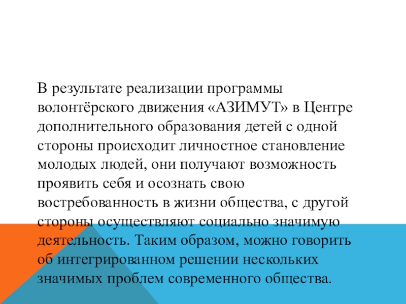 Слайд 9В результате реализации программы волонтёрского движения «АЗИМУТ» в Центре дополнительного образования