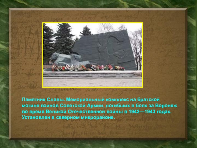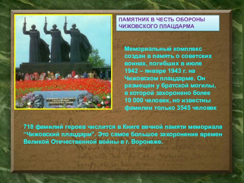 718 фамилий героев числится в Книге вечной памяти мемориала “Чижовский плацдарм”. Это самое большое захоронение времен Великой Отечественной войны в г. Воронеже.