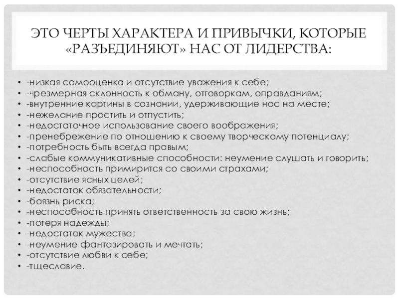 Слайд 12Это черты характера и привычки, которые «разъединяют» нас от лидерства:
