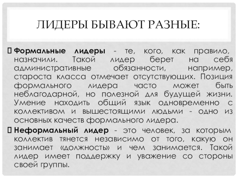 лидер берет на себя административные обязанности, например, староста класса отмечает отсутствующих. Позиция формального лидера часто может быть неблагодарной, но полезной для будущей жизни. Умение находить общий язык одновременно с коллективом и вышестоящими людьми - одно из основных качеств формального лидера.