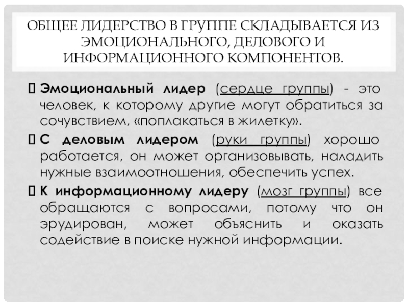 Слайд 7Общее лидерство в группе складывается из эмоционального, делового и информационного компонентов.