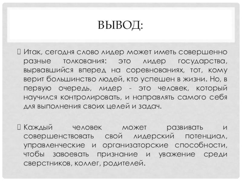 государства, вырвавшийся вперед на соревнованиях, тот, кому верит большинство людей, кто успешен в жизни. Но, в первую очередь, лидер - это человек, который научился контролировать, и направлять самого себя для выполнения своих целей и задач.