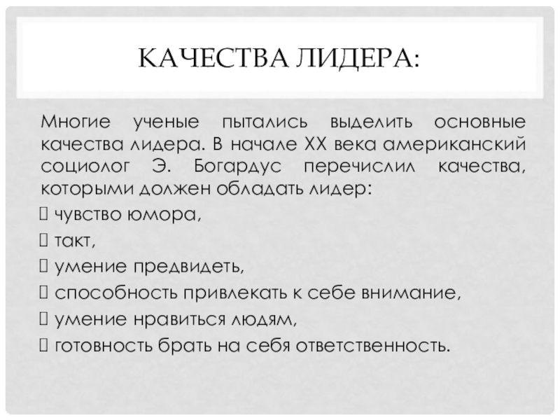 века американский социолог Э. Богардус перечислил качества, которыми должен обладать лидер: