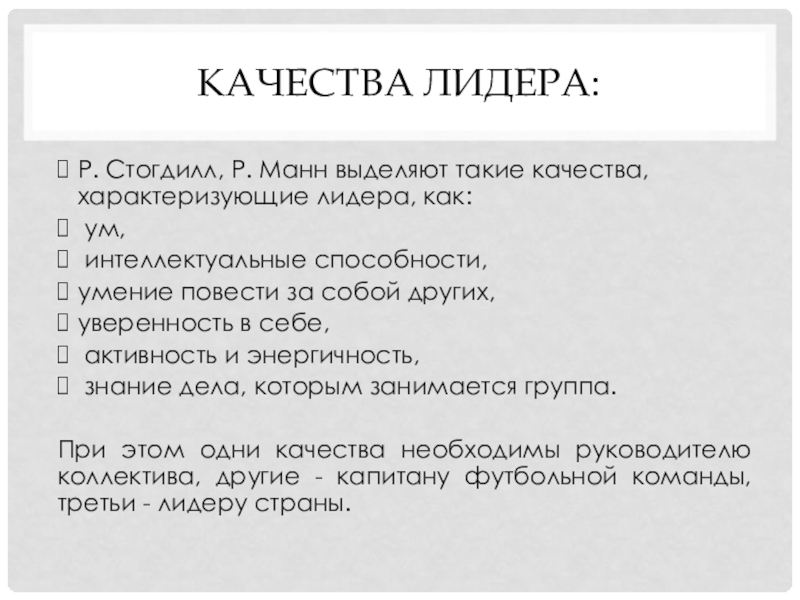 Р. Стогдилл, Р. Манн выделяют такие качества, характеризующие лидера, как: