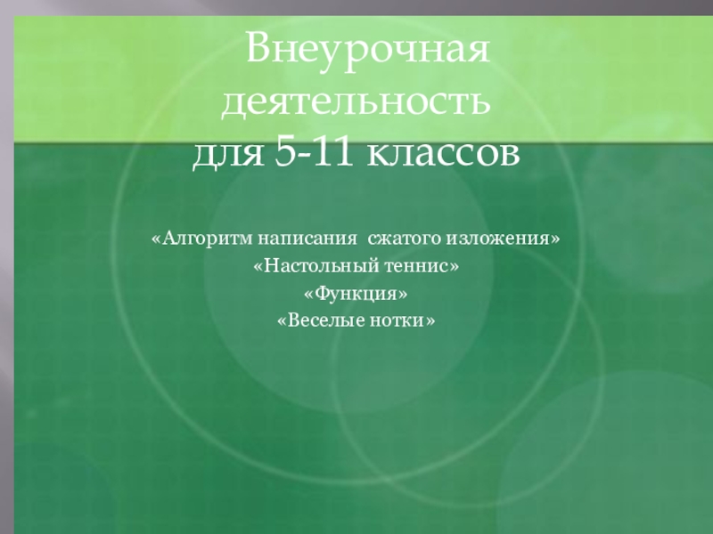 «Алгоритм написания сжатого изложения» «Настольный теннис»«Функция»«Веселые нотки» Внеурочная деятельностьдля 5-11 классов