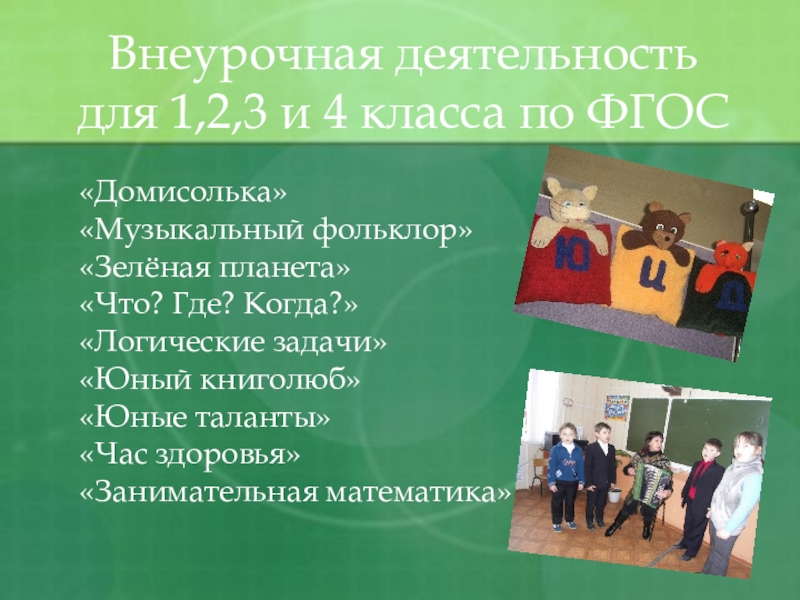 «Домисолька»«Музыкальный фольклор»«Зелёная планета»«Что? Где? Когда?»«Логические задачи»«Юный книголюб»«Юные таланты»«Час здоровья»«Занимательная математика»Внеурочная деятельность  для 1,2,3 и 4 класса