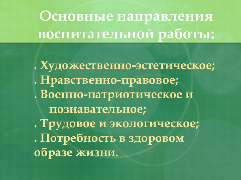Основные направления воспитательной работы:. Художественно-эстетическое;. Нравственно-правовое;. Военно-патриотическое и познавательное;. Трудовое и экологическое;. Потребность в здоровом образе жизни.