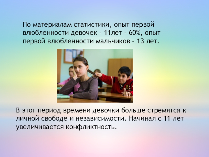 В этот период времени девочки больше стремятся к личной свободе и независимости. Начиная с 11 лет увеличивается конфликтность.