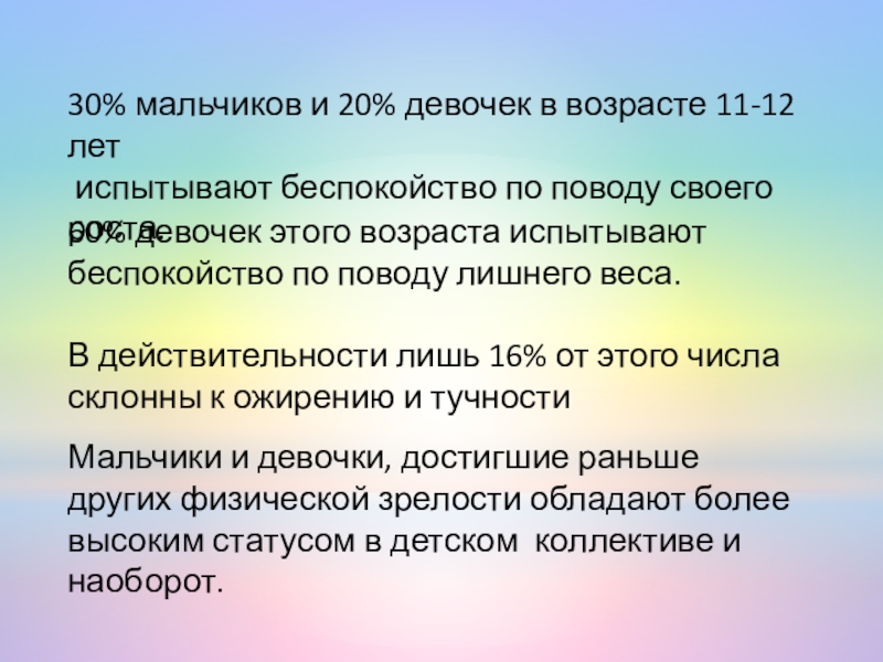 Мальчики и девочки, достигшие раньше других физической зрелости обладают более высоким статусом в детском коллективе и наоборот.