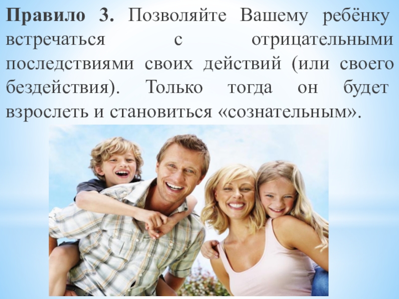 Слайд 24Правило 3. Позволяйте Вашему ребёнку встречаться с отрицательными последствиями своих действий