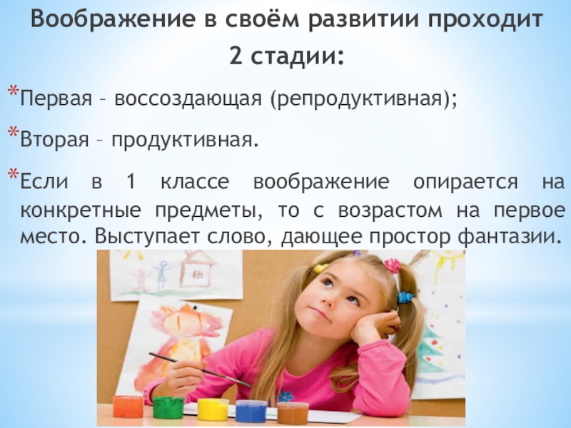 Если в 1 классе воображение опирается на конкретные предметы, то с возрастом на первое место. Выступает слово, дающее простор фантазии.