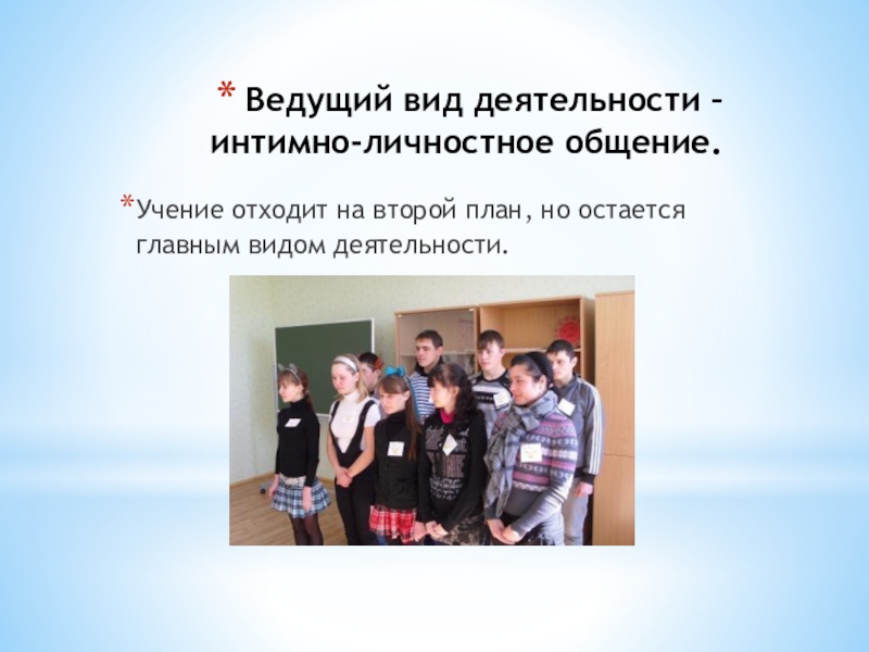 Слайд 28Ведущий вид деятельности – интимно-личностное общение.
