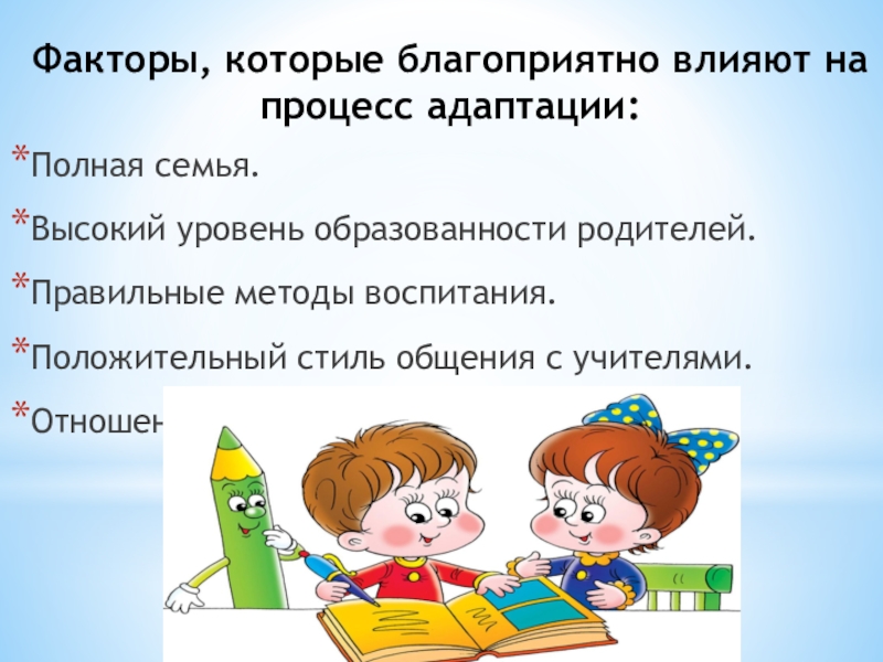 Слайд 5Факторы, которые благоприятно влияют на процесс адаптации: