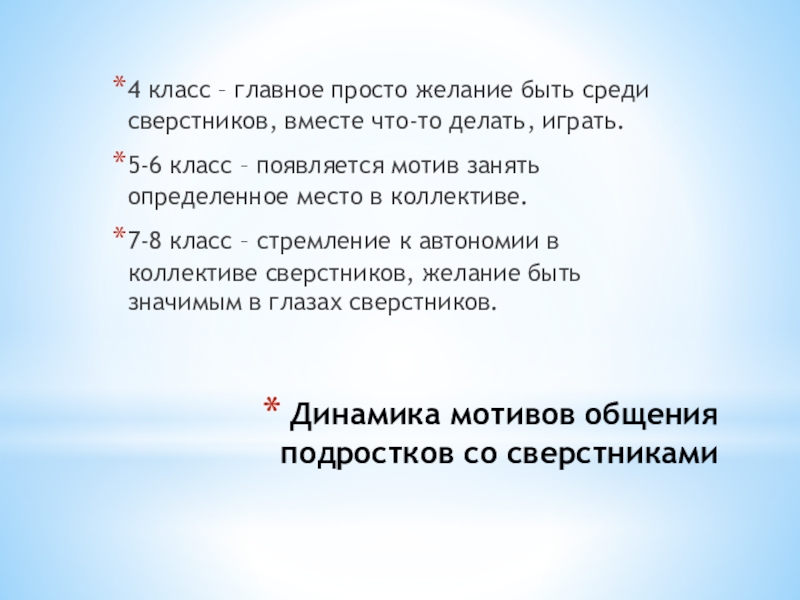 7-8 класс – стремление к автономии в коллективе сверстников, желание быть значимым в глазах сверстников.