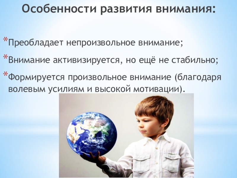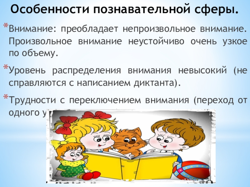 Внимание: преобладает непроизвольное внимание. Произвольное внимание неустойчиво очень узкое