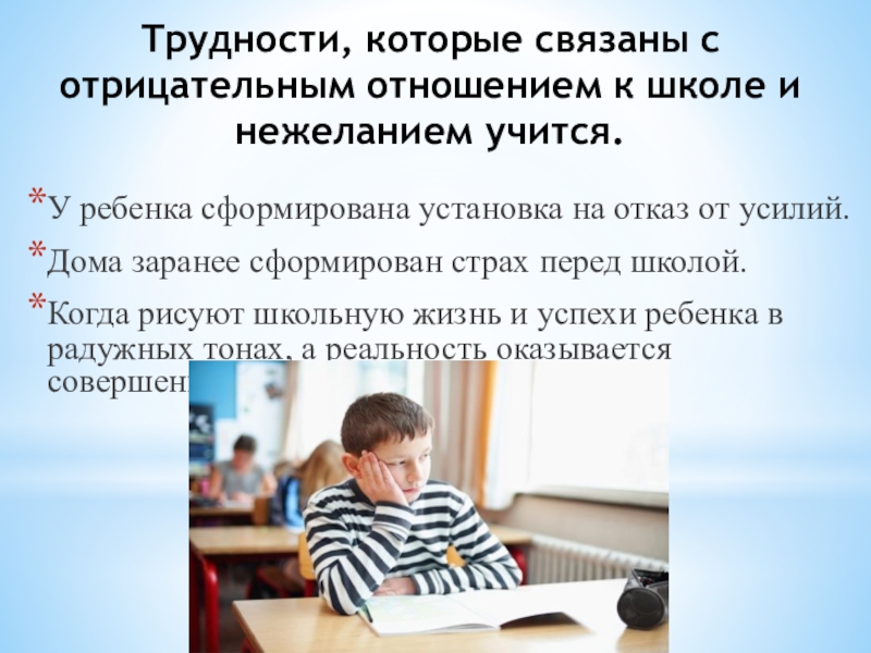 Слайд 4Трудности, которые связаны с отрицательным отношением к школе и нежеланием учится.