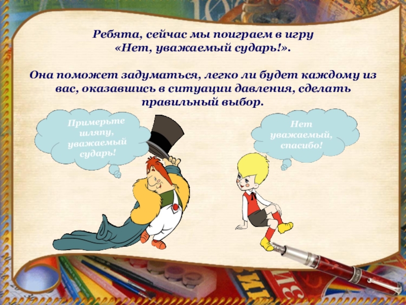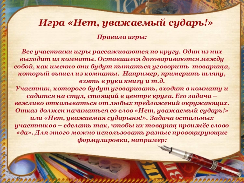 Слайд 16Игра «Нет, уважаемый сударь!»