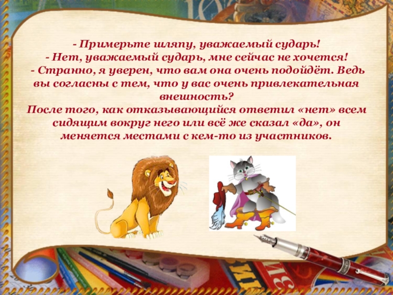 Слайд 17- Примерьте шляпу, уважаемый сударь!