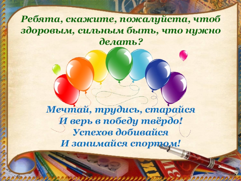 Слайд 23Ребята, скажите, пожалуйста, чтоб здоровым, сильным быть, что нужно делать?
