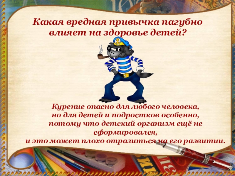 Слайд 8Какая вредная привычка пагубно влияет на здоровье детей?