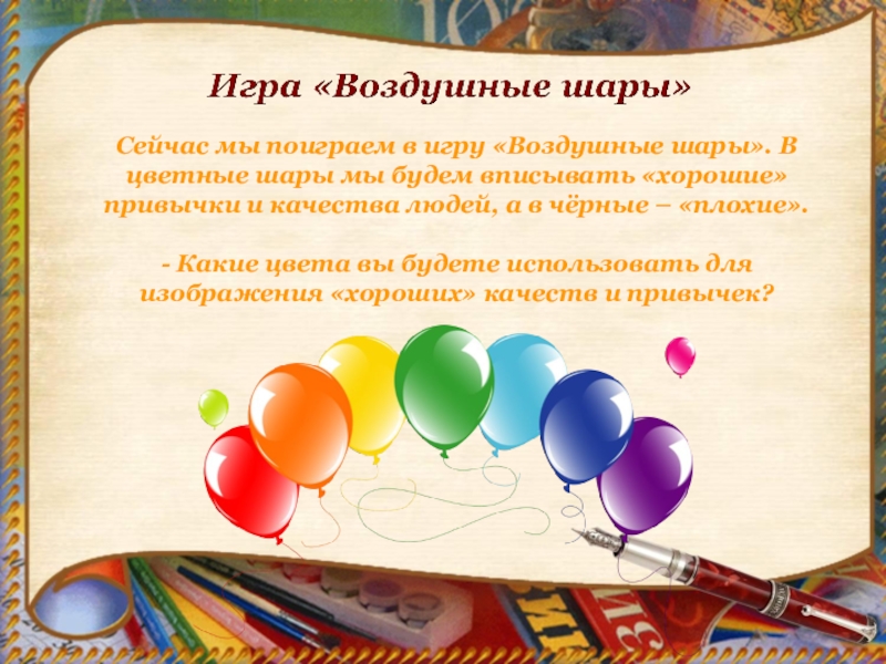 Слайд 4Сейчас мы поиграем в игру «Воздушные шары». В цветные шары мы