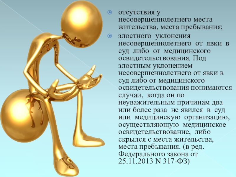 в суд либо от медицинского освидетельствования. Под злостным уклонением несовершеннолетнего от явки в суд либо от медицинского освидетельствования понимаются случаи, когда он по неуважительным причинам два или более раза не явился в суд или медицинскую организацию, осуществляющую медицинское освидетельствование, либо скрылся с места жительства, места пребывания. (в ред. Федерального закона от 25.11.2013 N 317-ФЗ)