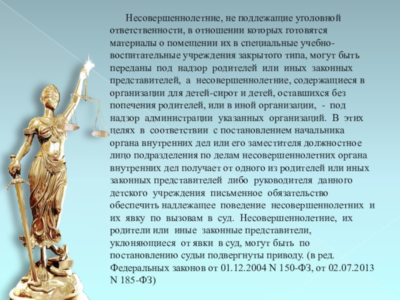 помещении их в специальные учебно-воспитательные учреждения закрытого типа, могут быть переданы под надзор родителей или иных законных представителей, а несовершеннолетние, содержащиеся в организации для детей-сирот и детей, оставшихся без попечения родителей, или в иной организации, - под надзор администрации указанных организаций. В этих целях в соответствии с постановлением начальника органа внутренних дел или его заместителя должностное лицо подразделения по делам несовершеннолетних органа внутренних дел получает от одного из родителей или иных законных представителей либо руководителя данного детского учреждения письменное обязательство обеспечить надлежащее поведение несовершеннолетних и их явку по вызовам в суд. Несовершеннолетние, их родители или иные законные представители, уклоняющиеся от явки в суд, могут быть по постановлению судьи подвергнуты приводу. (в ред. Федеральных законов от 01.12.2004 N 150-ФЗ, от 02.07.2013 N 185-ФЗ)