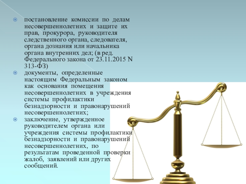 документы, определенные настоящим Федеральным законом как основания помещения несовершеннолетних в учреждения системы профилактики безнадзорности и правонарушений несовершеннолетних;