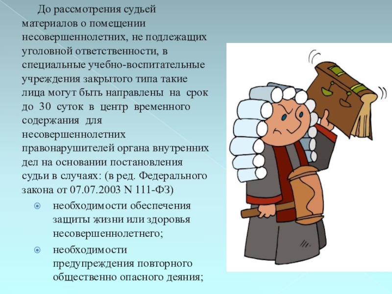 Слайд 12До рассмотрения судьей материалов о помещении несовершеннолетних, не подлежащих уголовной ответственности,