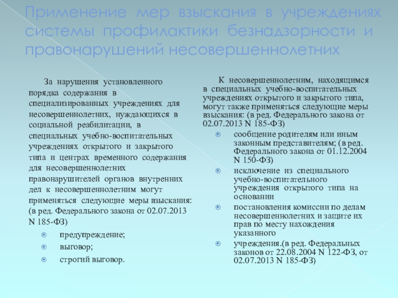 нарушения установленного порядка содержания в специализированных учреждениях для несовершеннолетних, нуждающихся в социальной реабилитации, в специальных учебно-воспитательных учреждениях открытого и закрытого типа и центрах временного содержания для несовершеннолетних правонарушителей органов внутренних дел к несовершеннолетним могут применяться следующие меры взыскания: (в ред. Федерального закона от 02.07.2013 N 185-ФЗ)