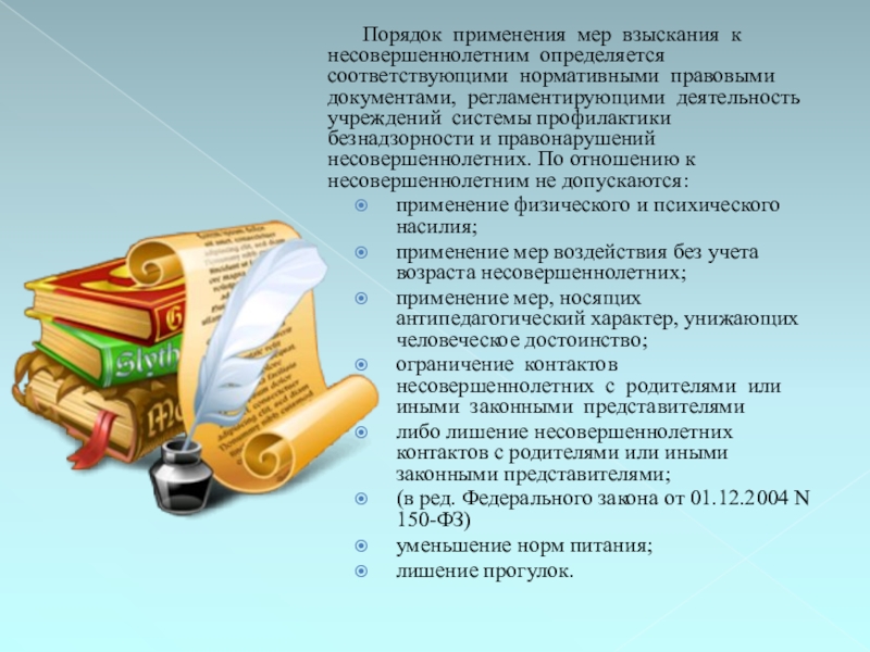 Слайд 8Порядок применения мер взыскания к несовершеннолетним определяется соответствующими нормативными правовыми документами,