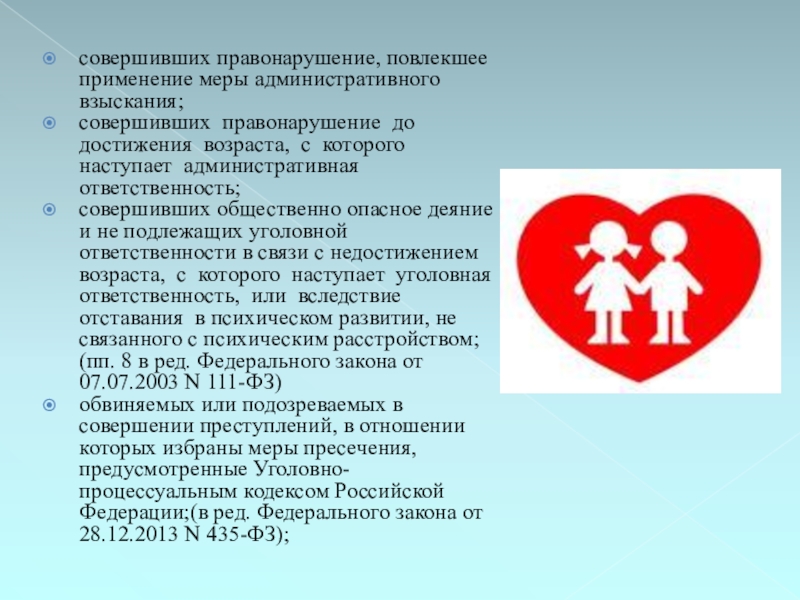 совершивших общественно опасное деяние и не подлежащих уголовной ответственности в связи с недостижением возраста, с которого наступает уголовная ответственность, или вследствие отставания в психическом развитии, не связанного с психическим расстройством; (пп. 8 в ред. Федерального закона от 07.07.2003 N 111-ФЗ)