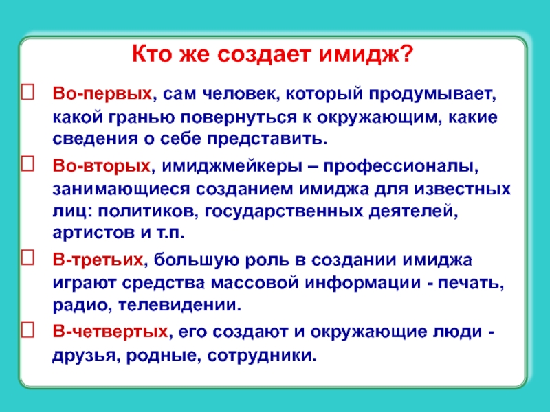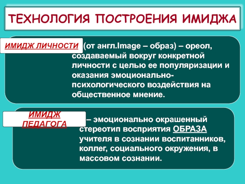 Имидж педагога – эмоционально окрашенный стереотип восприятия ОБРАЗА учителя в сознании воспитанников, коллег, социального окружения, в массовом сознании.