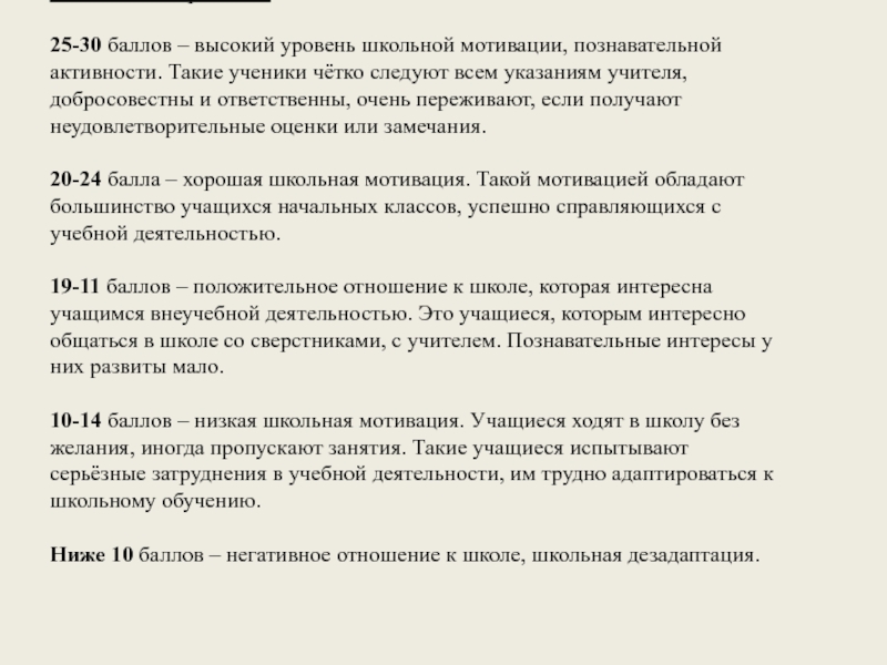 25-30 баллов – высокий уровень школьной мотивации, познавательной активности. Такие ученики