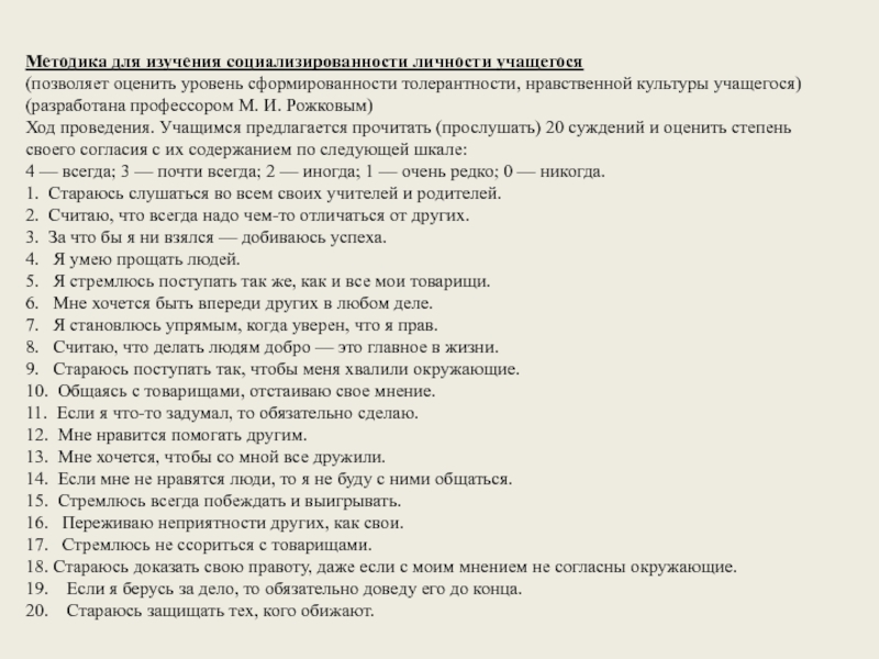 Ход проведения. Учащимся предлагается прочитать (прослушать) 20 суждений и оценить степень своего согласия с их содержанием по следующей шкале: