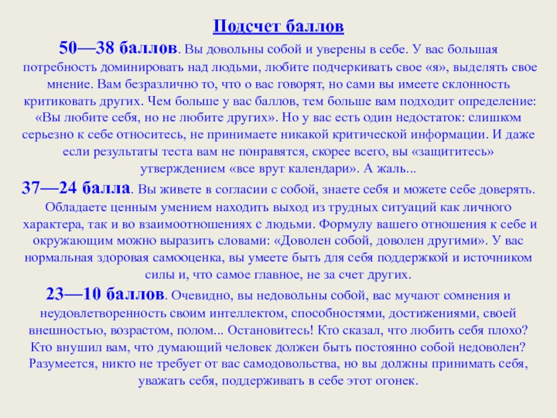 У вас большая потребность доминировать над людьми, любите подчеркивать свое «я», выделять свое мнение. Вам безразлично то, что о вас говорят, но сами вы имеете склонность критиковать других. Чем больше у вас баллов, тем больше вам подходит определение: «Вы любите себя, но не любите других». Но у вас есть один недостаток: слишком серьезно к себе относитесь, не принимаете никакой критической информации. И даже если результаты теста вам не понравятся, скорее всего, вы «защититесь» утверждением «все врут календари». А жаль...