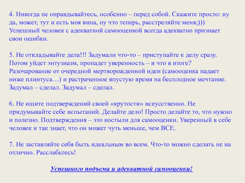 6. Не ищите подтверждений своей «крутости» искусственно. Не придумывайте себе испытаний. Делайте дело! Просто делайте то, что нужно и полезно. Подтверждения – это костыли для самооценки. Уверенный в себе человек и так знает, что он может чуть меньше, чем ВСЕ.