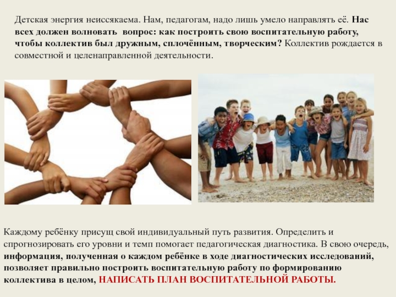 Каждому ребёнку присущ свой индивидуальный путь развития. Определить и спрогнозировать его уровни и темп помогает педагогическая диагностика. В свою очередь, информация, полученная о каждом ребёнке в ходе диагностических исследований, позволяет правильно построить воспитательную работу по формированию коллектива в целом, НАПИСАТЬ ПЛАН ВОСПИТАТЕЛЬНОЙ РАБОТЫ.