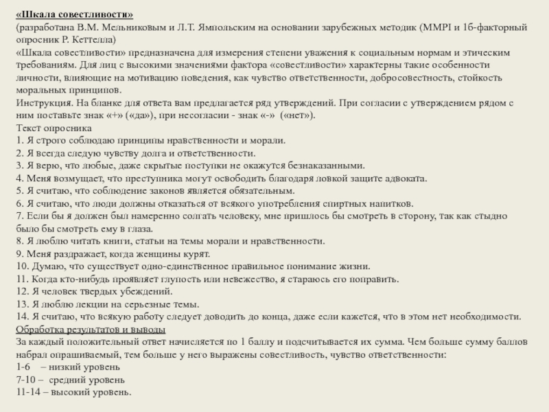 За каждый положительный ответ начисляется по 1 баллу и подсчитывается их сумма. Чем больше сумму баллов набрал опрашиваемый, тем больше у него выражены совестливость, чувство ответственности: