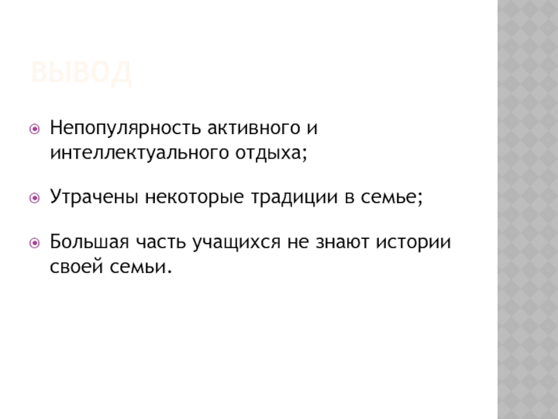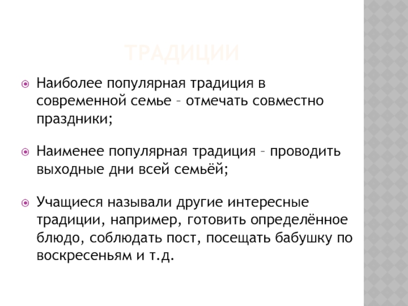 Учащиеся называли другие интересные традиции, например, готовить определённое блюдо, соблюдать пост, посещать бабушку по воскресеньям и т.д.