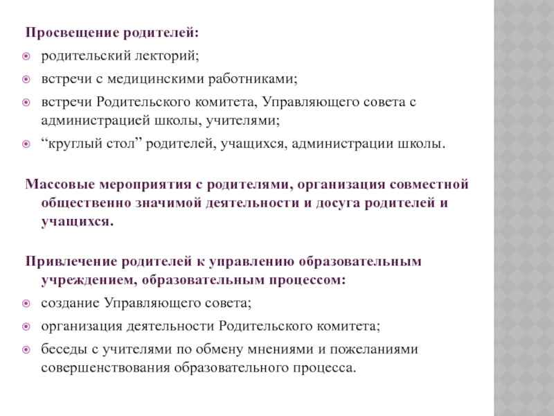 Привлечение родителей к управлению образовательным учреждением, образовательным процессом: