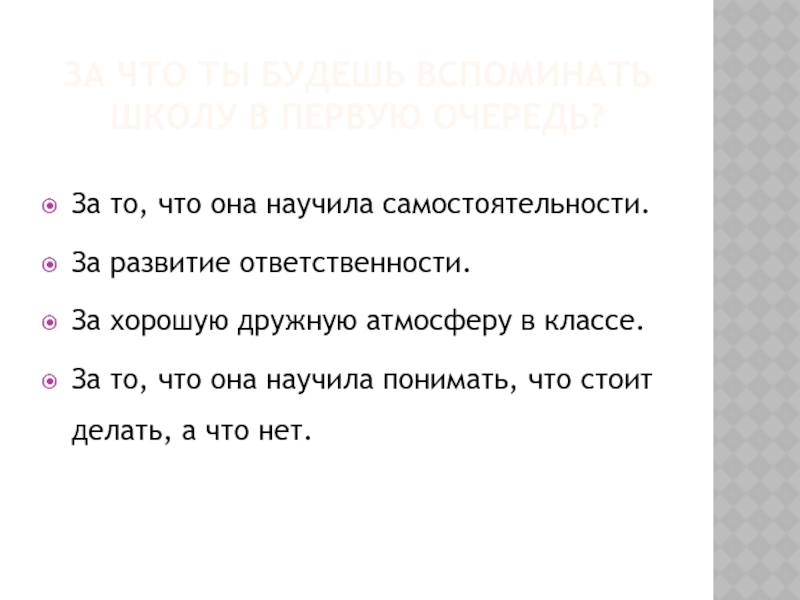 Слайд 25ЗА ЧТО ТЫ БУДЕШЬ ВСПОМИНАТЬ ШКОЛУ В ПЕРВУЮ ОЧЕРЕДЬ?