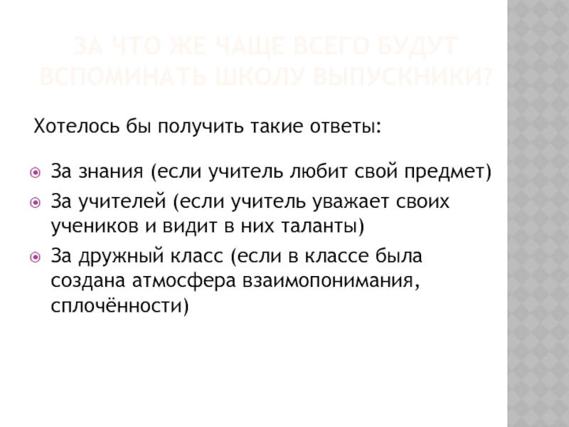 Слайд 26ЗА ЧТО ЖЕ ЧАЩЕ ВСЕГО БУДУТ ВСПОМИНАТЬ ШКОЛУ ВЫПУСКНИКИ?
