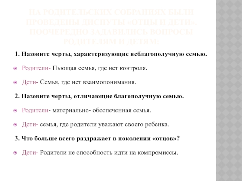 Слайд 20НА РОДИТЕЛЬСКИХ СОБРАНИЯХ БЫЛИ ПРОВЕДЕНЫ ДИСПУТЫ «ОТЦЫ И ДЕТИ». ПООЧЕРЕДНО ЗАДАВИЛИСЬ